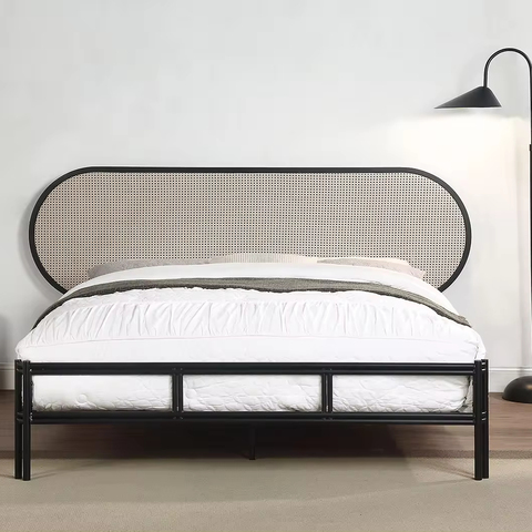 Meubles de chambre à coucher de style moderne de luxe Cadre de lits en métal avec tête de lit en rotin Home Hotel