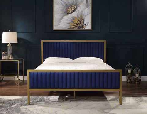 Tête de lit rembourrée en velours bleu de haute qualité, design moderne, avec panneaux, cadre de lit en métal doré
